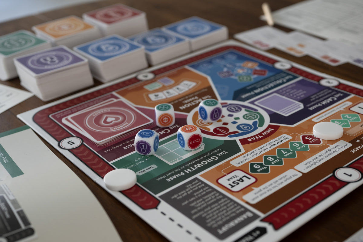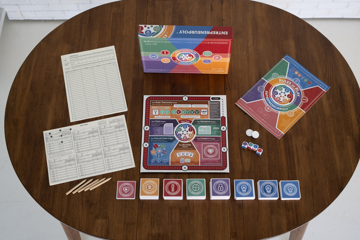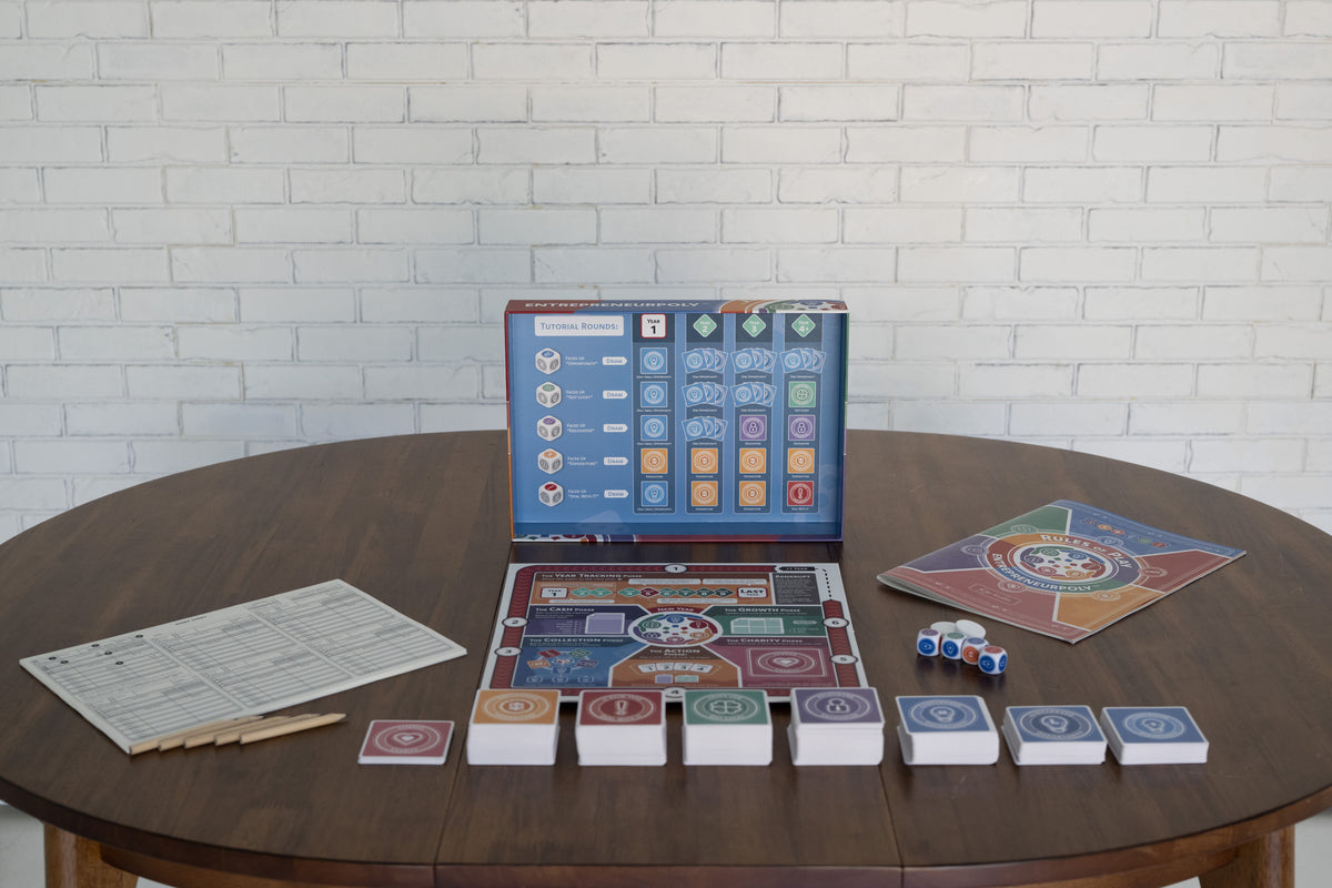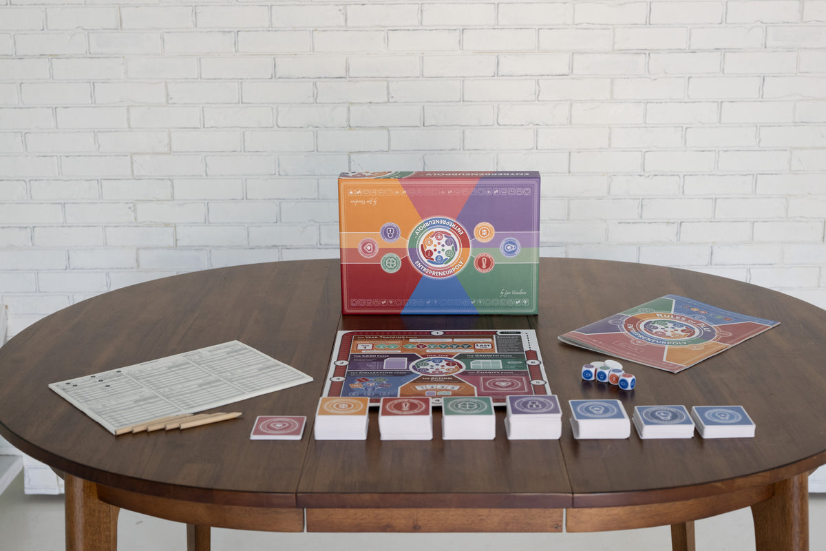 Entrepreneurpoly was born from a desire to bridge the gap between the classroom and real-world entrepreneurship. Created by entrepreneurs for entrepreneurs, this game is more than just entertainment; it's an immersive simulation that mirrors the highs and lows of building a business. With every dice roll and card draw, players experience the challenges, risks, and rewards that come with starting and scaling a business. Whether you’re negotiating a deal, navigating an unexpected expense, or seizing a lucky break, Entrepreneurpoly brings the entrepreneurial journey to life in a fun and engaging way.
